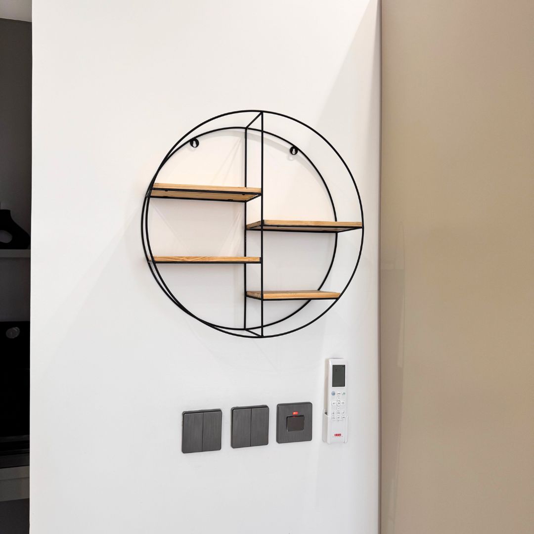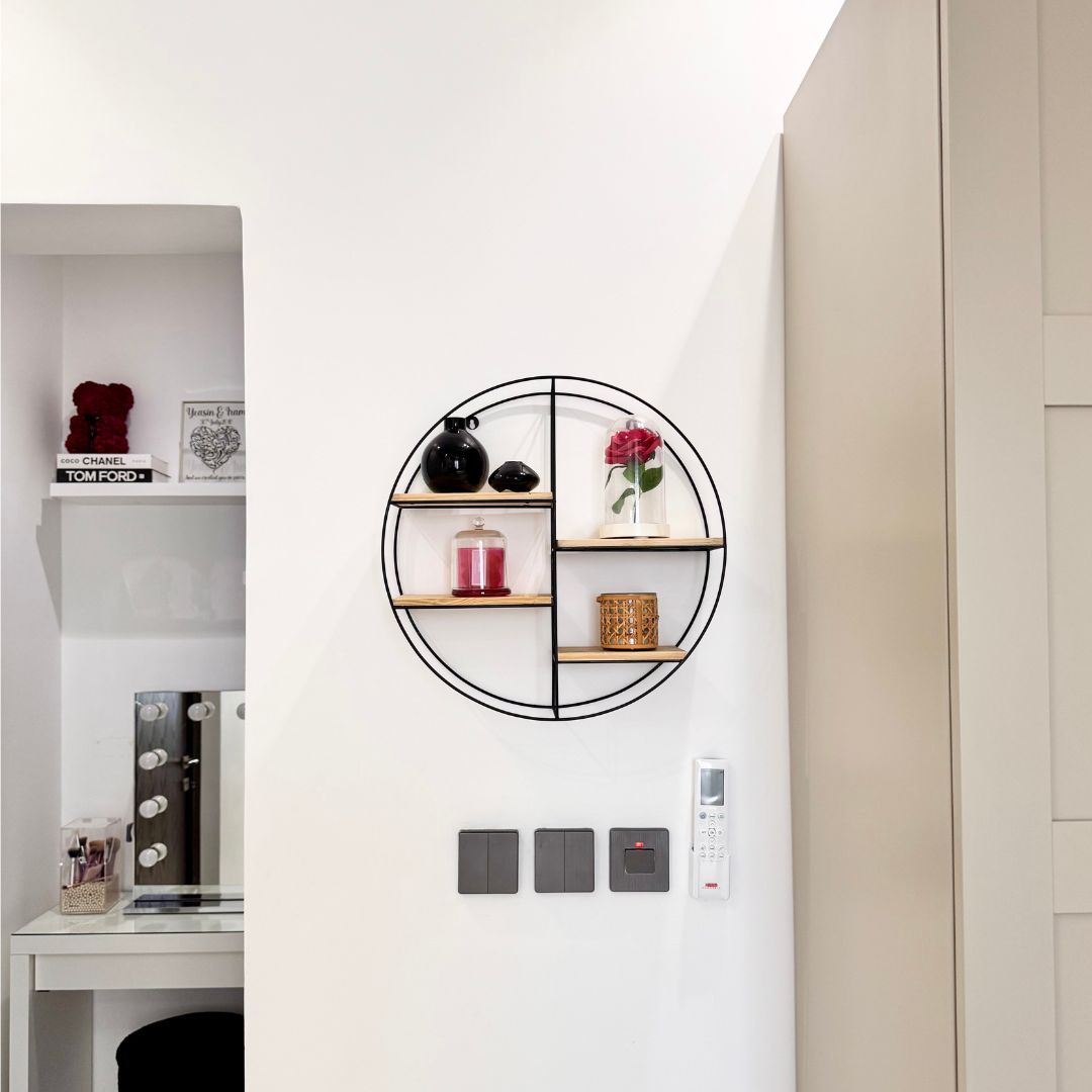1️⃣ Modern & Stylish Design – A sleek, round metal frame in matte black combined with light wood shelves brings a minimalist yet luxurious feel to any space.